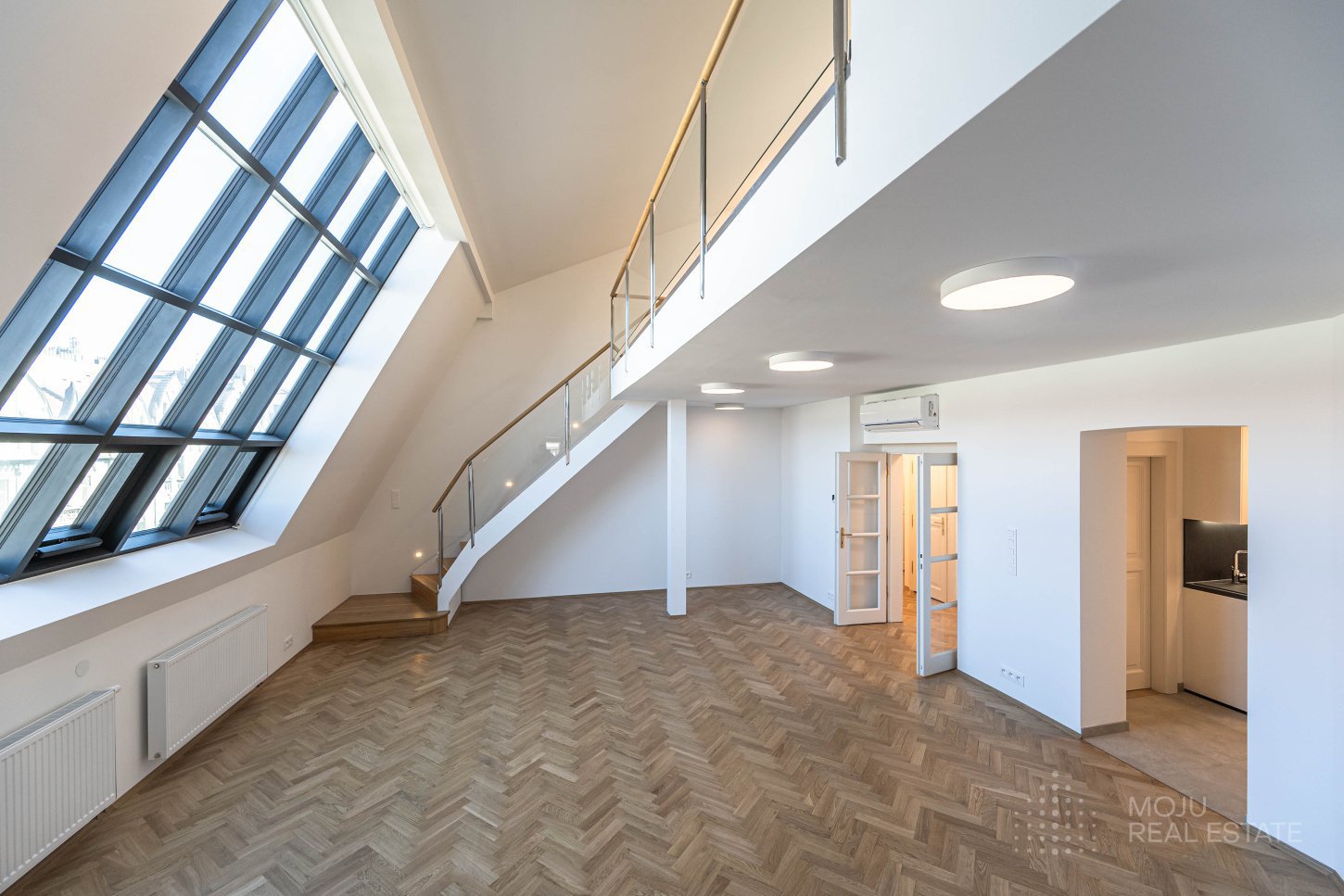We offer for rent a newly renovated, duplex atelier, located on the 5th floor of an apartment building with an elevator. The layout offers a spacious living room, fully equipped kitchen, bedroom with access to small balconies, toilet, pantry and entrance hall on the lower floor. The upper floor offers a gallery with a sleeping area or study and a bathroom with toilet. The studio has a wonderful atmosphere and is located in a desirable location in Prague 2 - Vinohrady, which provides all civic amenities in the vicinity. Excellent transport accessibility, a tram stop right in front of the house, metro station C Muzeum, or metro station A Náměstí Míru, is within walking distance. Unfortunately, we do not have PENB available, therefore we list energy class G.